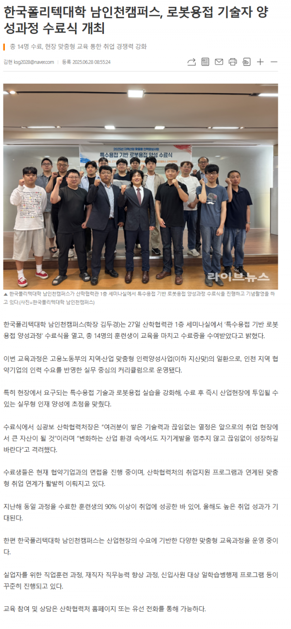 한국폴리텍대학 남인천캠퍼스, 로봇용접 기술자 양성과정 수료식 개최