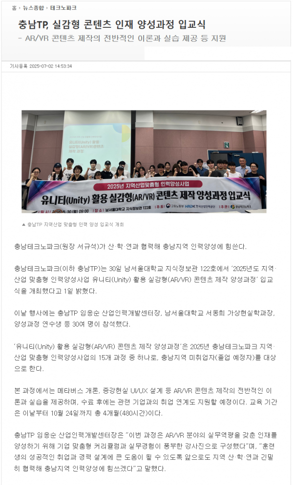 충남TP, 실감형 콘텐츠 인재 양성과정 입교식