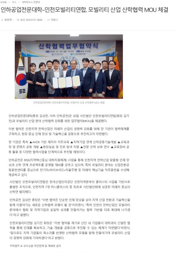 인하공업전문대학–인천모빌리티연합, 모빌리티 산업 산학협력 MOU 체결