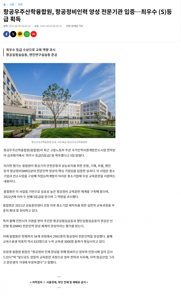 항공우주산학융합원, 항공정비인력 양성 전문기관 입증…최우수 (S)등급 획득