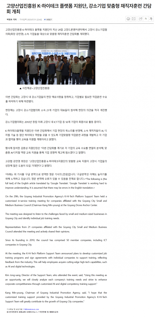 고양산업진흥원 K-하이테크 플랫폼 지원단, 강소기업 맞춤형 재직자훈련 간담회 개최