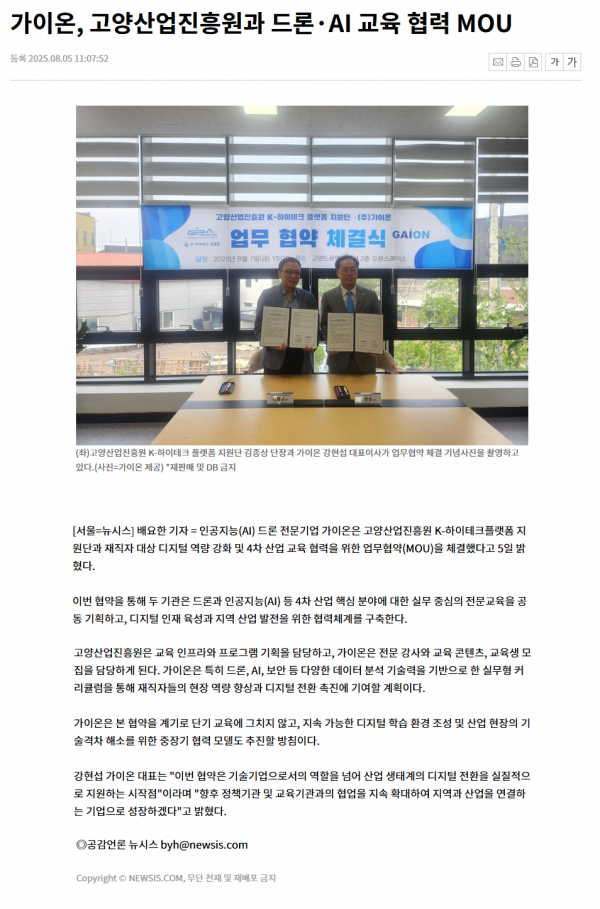 가이온, 고양산업진흥원과 드론·AI 교육 협력 MOU