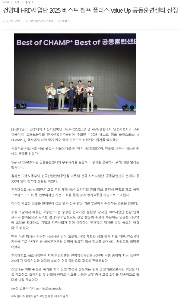 건양대 HRD사업단 2025 베스트 챔프 플러스 Value Up 공동훈련센터 선정