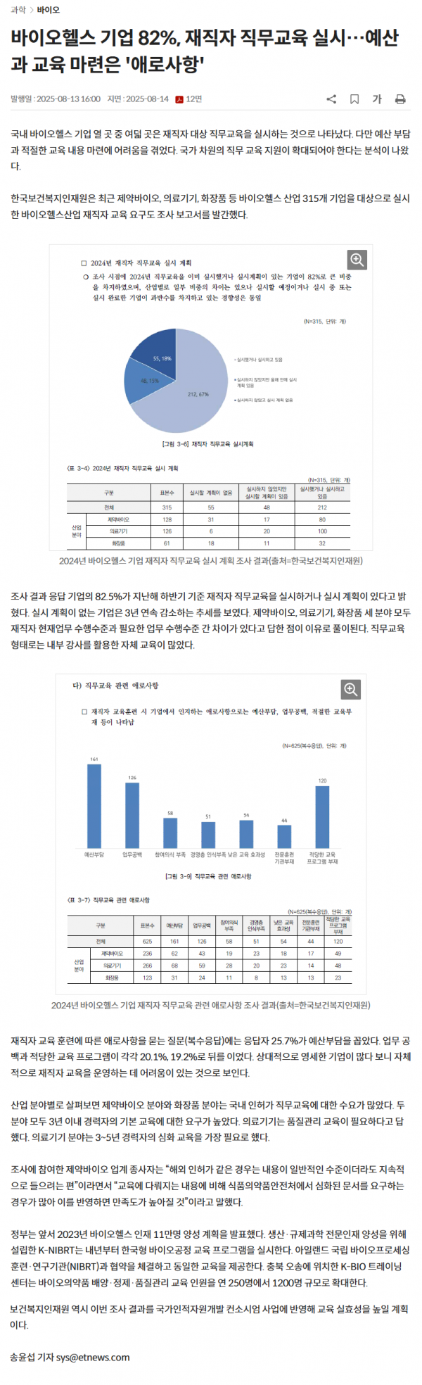 바이오헬스 기업 82%, 재직자 직무교육 실시…예산과 교육 마련은 '애로사항'