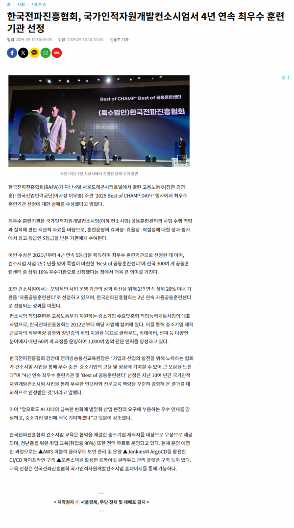 한국전파진흥협회, 국가인적자원개발컨소시엄서 4년 연속 최우수 훈련기관 선정