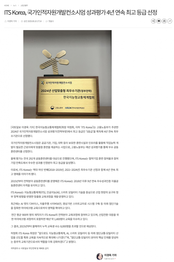ITS Korea, 국가인적자원개발컨소시엄 성과평가 4년 연속 최고 등급 선정