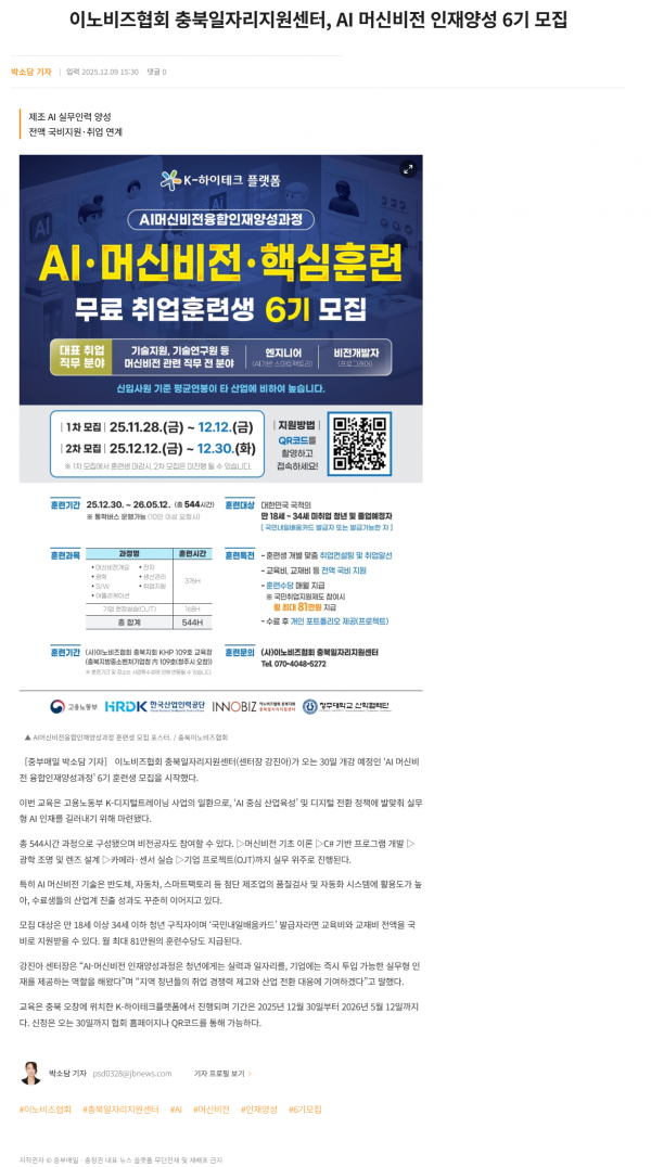 이노비즈협회 충북일자리지원센터, AI 머신비전 인재양성 6기 모집