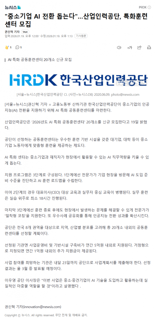 "중소기업 AI 전환 돕는다"…산업인력공단, 특화훈련센터 모집