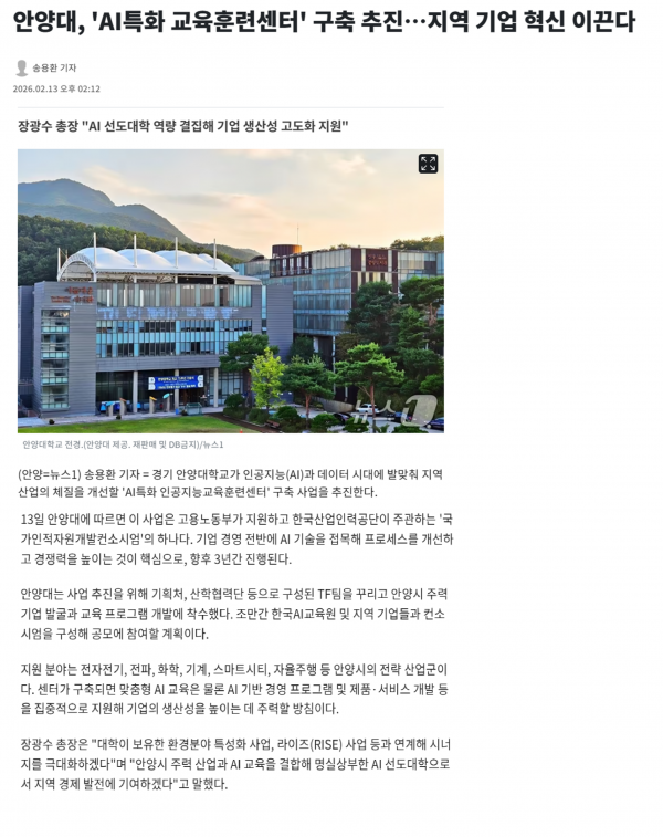 안양대, 'AI특화 교육훈련센터' 구축 추진…지역 기업 혁신 이끈다